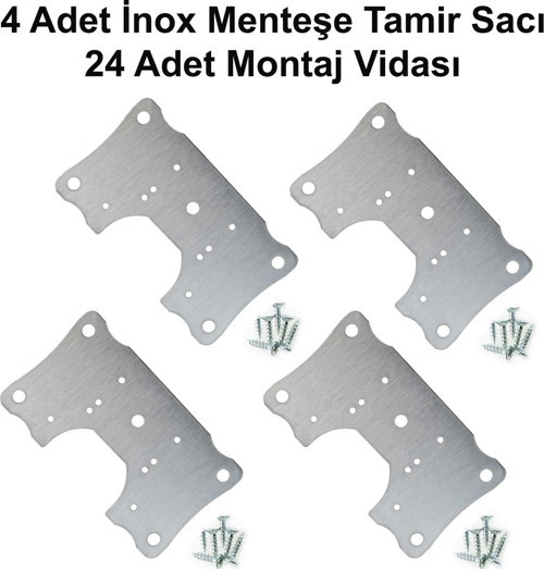4 adet (8,5 x 5 cm) menteşe tamir sacı ve 24 adet (4*16) vida bulunmaktadır.
