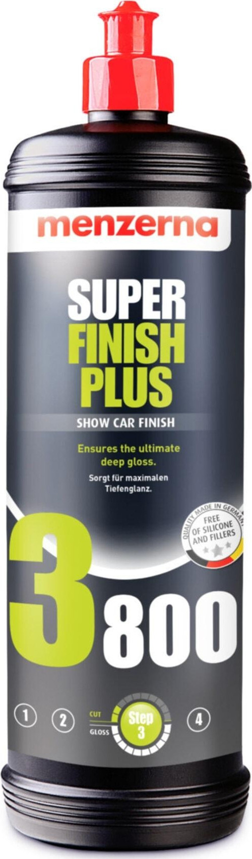 Menzerna SUPER FINISH dolgu maddesi ve silikon içermez, içerdiği mikro aşındırıcılar ile hafif çizik giderici pasta gibi çalışırken ultra ince cila gibi hologramsız ayna gibi parlak yüzey oluşumu sağlar.