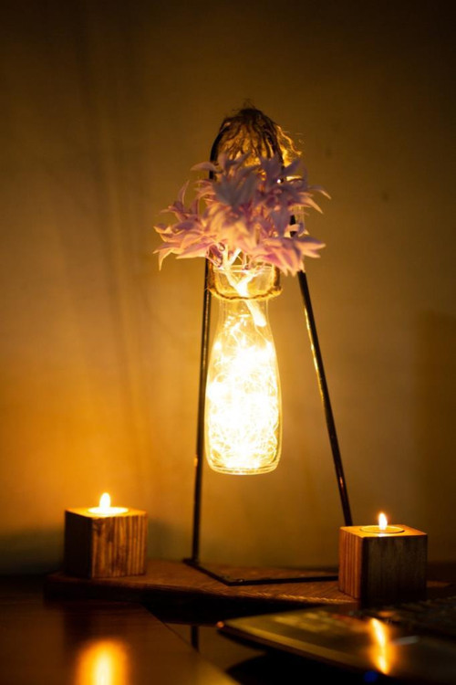 Dekoratif Ahşap Mumluk Hediyelik LED Işıklı Cam Masa Süsü