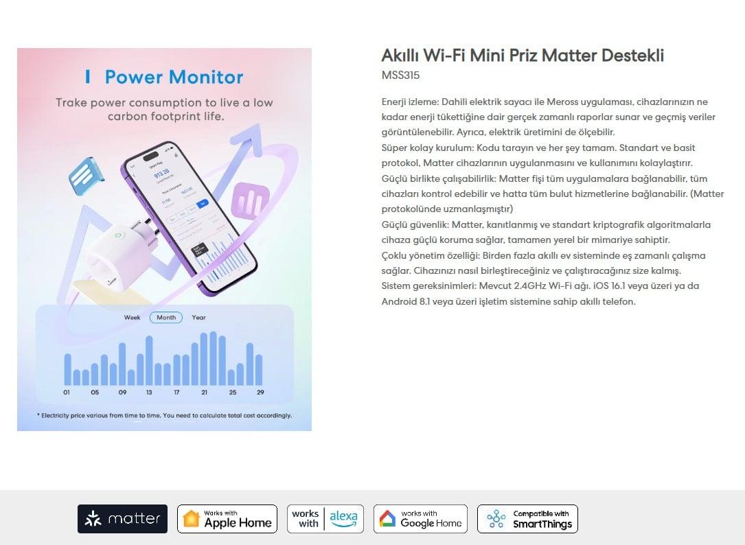 Meross Matter Akıllı Wi-Fi Mini Priz 3'lü Paket (Apple HomeKit, Alexa ve Google Home Destekli)