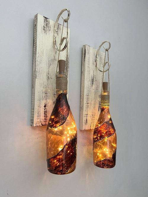 Mes Reves Design Led Işıklı Ahşap Kahverengi Vitray Cam Salon Bar Bahçe Dekoru Şampanya Şişesi Aplik 2 Li Set