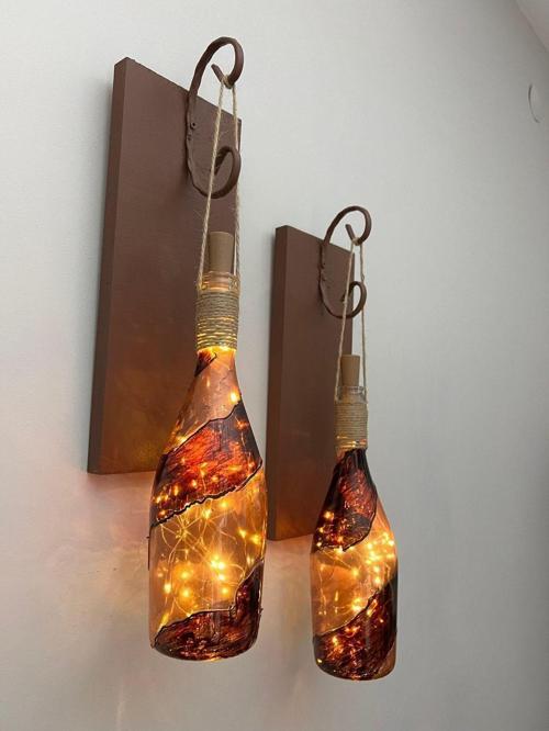 Mes Reves Design Led Işıklı Ahşap Kahverengi Vitray Cam Salon Bar Bahçe Dekoru Şampanya Şişesi Aplik 2'Li Set