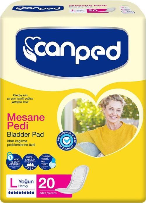 Canped Mesane Pedi L (Yoğun) 80'li (4 Paket X 20 Adet) Idrar kaçırma problemlerine özel mesane pedi Kadın anatomisine uygun yapısı ile idrar kaçırma problemlerinde kadınların kendilerini güvende hissetmelerini sağlar •özel anatomik yapısı ve içeriğindeki özel emici tanecikleri ile, idrar kaçırma problemi için en uygun hijyenik çözümdür. ; •özel emici tanecikler, hem sıvıyı hem de kokuyu hapsetme özelliğine sahiptir. ; •idrarın hızla emilerek jel haline gelmesini sağlar, kuru hissettirir. ; •anatomik yapısı ile vücuda tam uyumludur. ; •geniş yapışkan şerit çamaşırı sıkıca tutar, pedin kaymasını önler •kenar lastikleri anatomik şekli kazandırır ve sızmalara karşı korur. ; Not: Ürün 1 paket olarak gönderilir paket içerisinde 20 adet mesane pedi bulunur.;