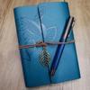 Deri yaprak desenli defter ve lacivert metal kalem ile oldukça şık görünmektedir.