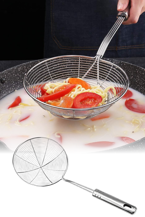 Omilife Metal Yağ Kevgiri 12 cm Paslanmaz Çelik Yağ Süzgeci Kızartma ve Haşlama Sonrası Pratik Uzun Saplı Ergonomik Tasarımlı Dayanıklı Yapısıyla Mutfakta Kullanışlı Kevgir