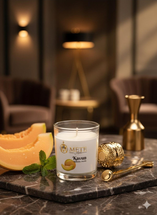 Yazın tatlı ve sulu lezzetini evinize taşıyın! Kavun aromalı mumumuz, şık cam bardak ambalajı ve lüks iç mekan sunumuyla dikkat çeker.
