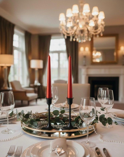 Şamdan mumları kullanarak zarif ve sofistike bir masa düzeni sergilemektedir.