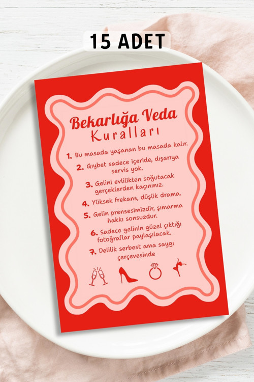 Kart üzerinde yer alan eğlenceli ve cesaret isteyen “Bekarlığa Veda Kuralları”, tüm nedimeleri, arkadaşları ve gelini kahkahaya boğacak! .