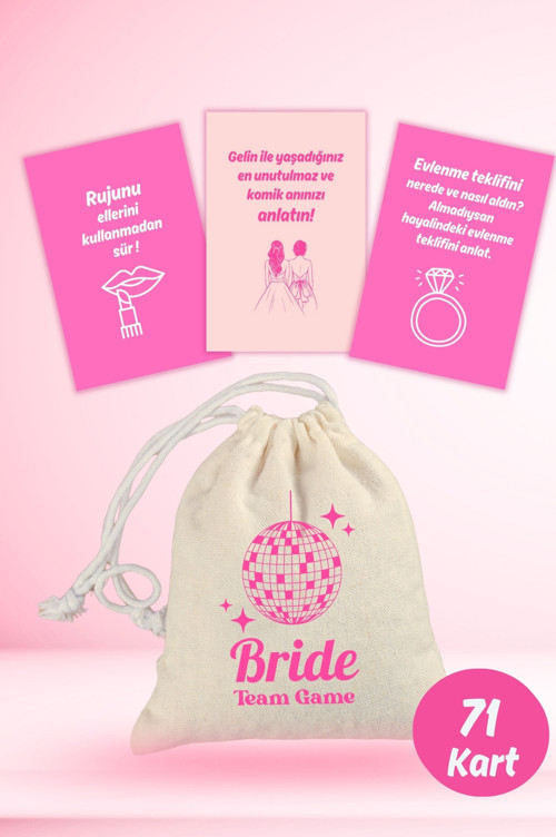 Bekarlığa veda partinizi unutulmaz kılacak, kahkahalarla dolu bir oyun arıyorsanız doğru yerdesiniz! "Bride Team Game" kart oyunu, 71 karttan oluşan eğlenceli ve anlamlı içerikleriyle gelin ve nedimelere unutulmaz anılar yaşatır.