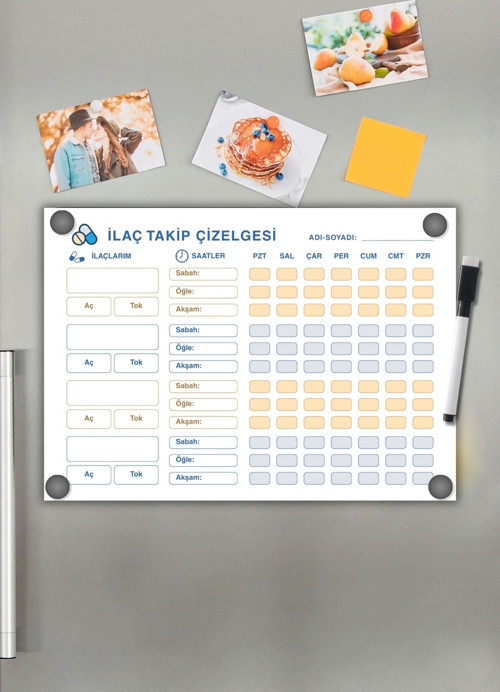 Buzdolabına ya da metal yüzeylere kolayca yapışan mıknatıslı ilaç takip tablosu, evde ilaç takibini sade, anlaşılır ve etkili hale getirir.