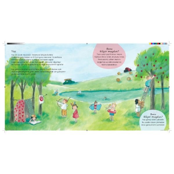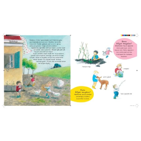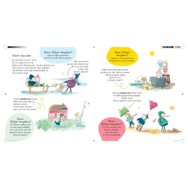 Bu kitapta, mevsimler hakkında merak edilen en temel soruların cevapları yer alıyor. Yumuşacık ve açıklayıcı çizimleri, her mevsim yapılacak en iyi işler listesi, yanlara açılan geniş sayfaları ve soru-cevaplarıyla meraklı çocukların ufkunu genişletiyor.