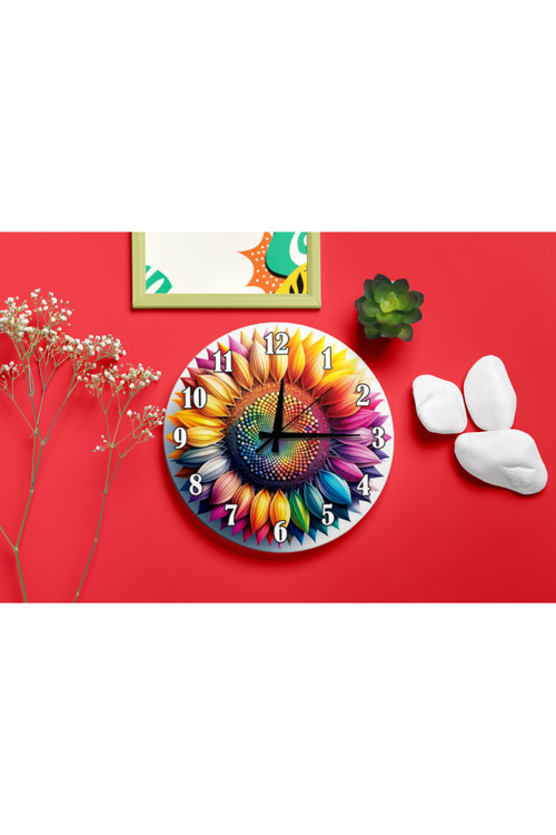 M&H Quality Gökkuşağı Ayçiçeği Baskılı Canlı Ve Enerjik Sessiz Duvar Saati 40 Cm