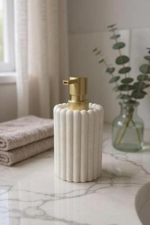 Mien MEN CN56805 Gold Pompalı Krem Renk Polyresin Sıvı Sabunluk, 380 ml kapasitesi ile banyo ve mutfakta şık ve kullanışlı bir kullanım sunar. Polyresin malzemesi dayanıklı ve uzun ömürlüdür. Gold pompalı tasarımı, sabun kullanımını pratik ve estetik hale getirir.