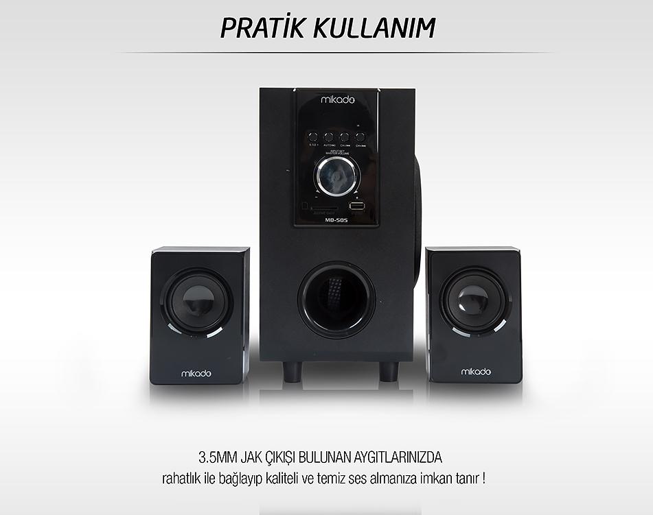 Mikado MD-505 5+1 Usb+SD+FM Destekli Bluetooth Speaker ; 3MM JAK çıkışı bulunan tüm aygıtlarınıza rahatlık ile bağlayıp kaliteli ve temiz ses almanıza imkan tanır. MD-505'i Laptop, Masaüstü bilgisayarınızda adaptörü ile çalıştırarak mp3 çalar, akıllı telefon tablet vb. uygun çıkışları bulunan tüm aygıtlarınızda sorunsuz olarak kullanabilirsiniz. Hoparlörler üzerindeki şık tasarımı ile ürüne hoş bir görünüm kazandırmış olup masanızda, evinizde, ve ürünü kullandığınız benzeri yerlerde görsel bütünlüğü asla bozmaz.