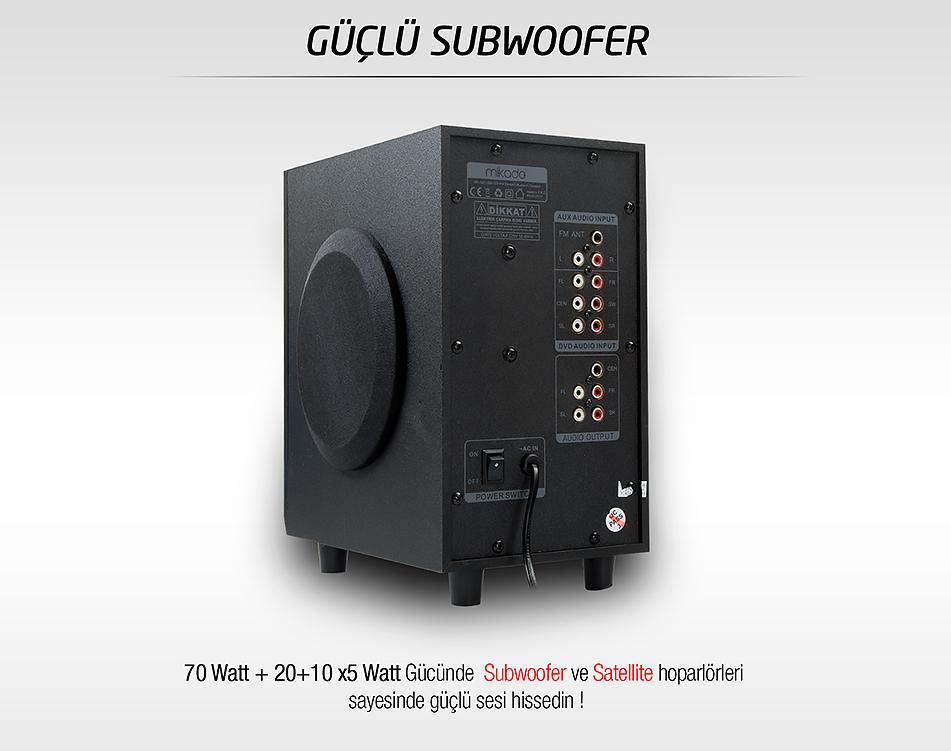Mikado MD-505 5+1 Usb+SD+FM Destekli Bluetooth Speaker ; 70Watt gücünde ki Subwoofer'ın ön yüzeyine yerleştirilmiş olan tuşlar sayesinde rahatlıkla istediğiniz işlemleri gerçekleştirebilirsiniz. Subwoofer kaliteli sesin odak noktası !