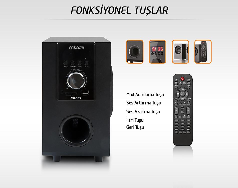 Mikado MD-505 5+1 Usb+SD+FM Destekli Bluetooth Speaker ; Üzerinde bulunan fonksiyonel tuşlar ve uzaktan kumanda sayesinde dinlediğiniz müzikleri rahatlıkla ileri alabilir, durdurabilir, geri alabilirsiniz. Mode tuşu ile dilerseniz takmış olduğunuz Flashdisk ve SD karttaki muzikleri dilerseniz de aux ile bağlamış olduğunuz aygıtınızdaki müzikleri rahatlıkla dinleyebilirsiniz. Uzaktan kumandası sayesinde yerinizden kıpırdamadan rahatlıkla aynı işlemleri gerçekleştirmenize imkan tanır !