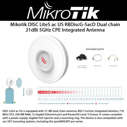 Mikrotik dış mekan kablosuz CPE DISC Lite5 ac 21 dBi çift zincirli anten, 5GHz 802.11a/n/ac ile ABD
