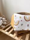 Bu üründeki gökkuşağı desenli ve sarı düz müslin örtülerimiz %100 Pamuktan yapılmıştır. Müslin örtülerimiz nefes alabilen kumaştır bebeğinizi terletmez. Zararlı madde içermez.