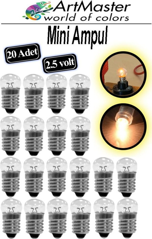 Ürün Adı: Artmaster Mini Ampul 2.5 Volt 20 Adet Okul Sınıf Elektrik Devre Küçük Elektrik Deney Ampulü 2.5 Volt Deney Ampulü Küçük Boy