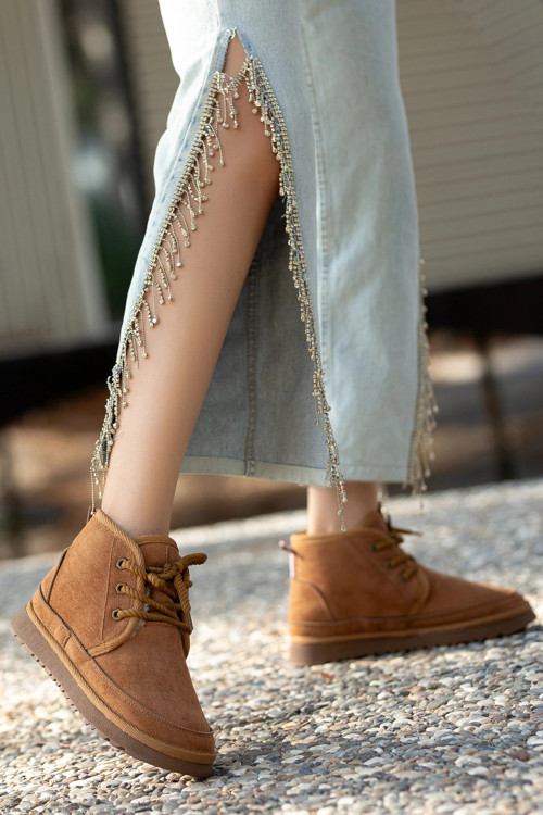Mini İçi Kürk Astarlı Taba Alçak Taban Bağcıklı Rahat Kadın Bot