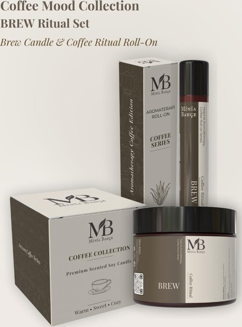 Brew Ritüel İkili Set; kahve ve vanilyanın sıcak–tatlı karakterini taşıyan doğal soya wax Brew mum ile biberiye, nane, limon ve sedir yağlarının ferahlatıcı bileşiminden oluşan Brew aroma roll’un uyumunu bir araya getirir. Ev, ofis ve kişisel rutinlerde zihin açıcı, tazeleyici ve odak artırıcı bir koku ritüeli sunar.