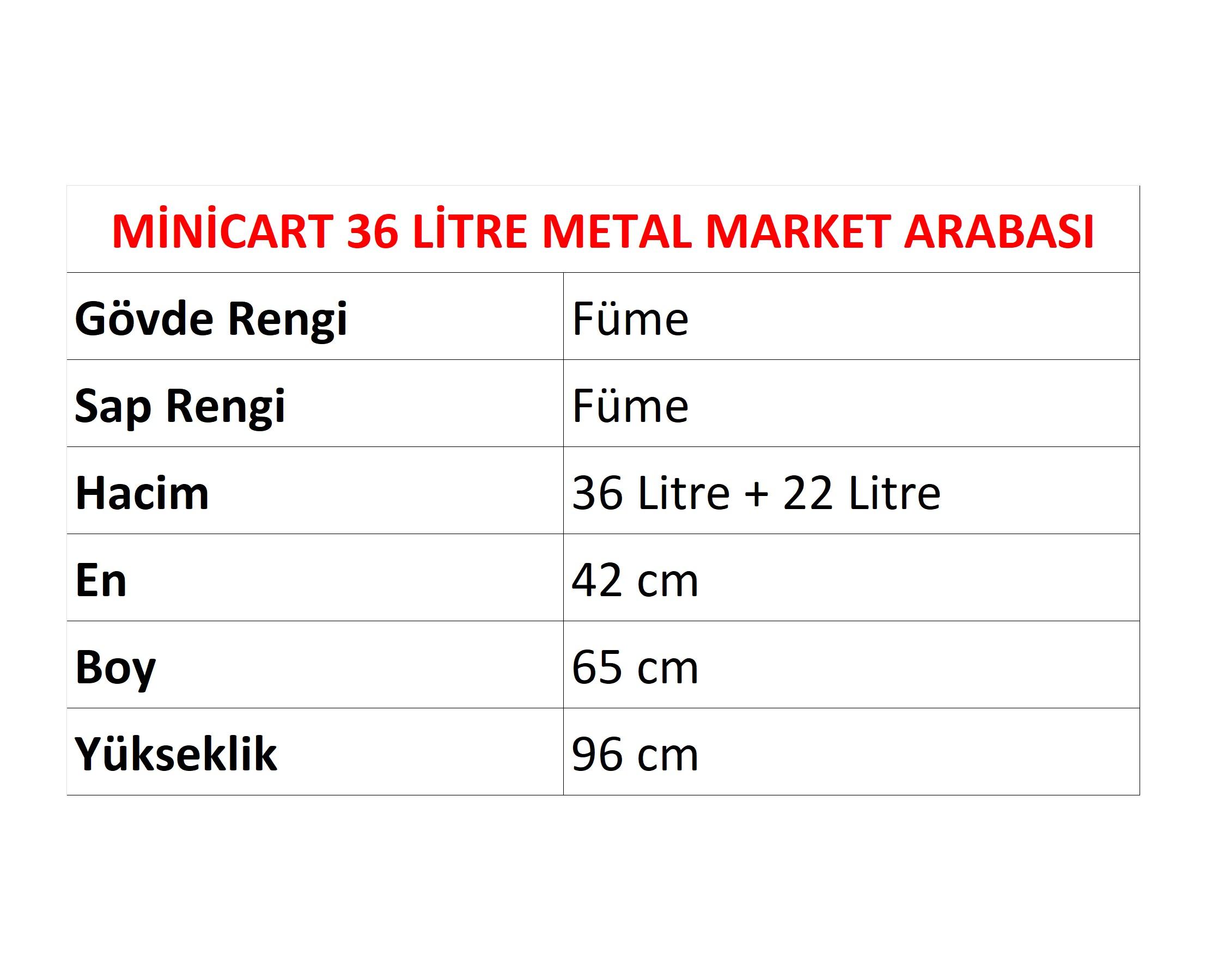 Minicart metal market arabası 36 litre olarak üretilmektedir. Sap ve gövde rengi standart olarak füme renkte sunulan minicart metal market arabası, özel istek doğrultusunda farklı renk ve ölçülerde üretilebilmektedir. Minicart metal market arabasının sap kısımlarını özel istek doğrultusunda firma mağaza logonuz ile baskılı alma seçeneği de bulunmaktadır.