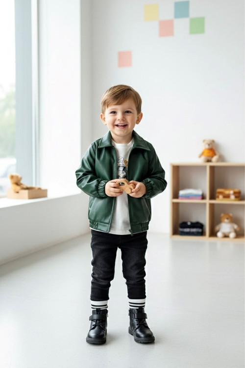 Minigimin Cicileri Astarlı Yumuşak Deri Trençkotlu Erkek Çocuk 3 Lü Takım - Yeşil