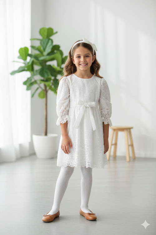 Minigimin Cicileri Brode Çiçek Detaylı Kız Çocuk Elbise - Beyaz