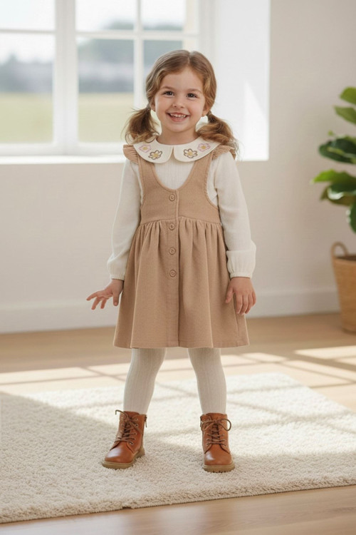 Minigimin Cicileri Müslim Gömlekli Fitilli Kadife Elbise Takım - Camel