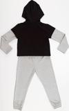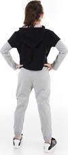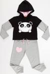 2 parça kız çocuk eşofman takım. Takımın üstünde iki farkı renk kumaş kullanılmıştır ve crop-top olarak tasarlanmıştır. Pamuklu orta kalın kumaştan tasarlanmış eşofman üstü panda baskılıdır ve kapüşonludur. Eşofman altının beli lastiklidir. Üzerinde kalp aplikesi vardır.