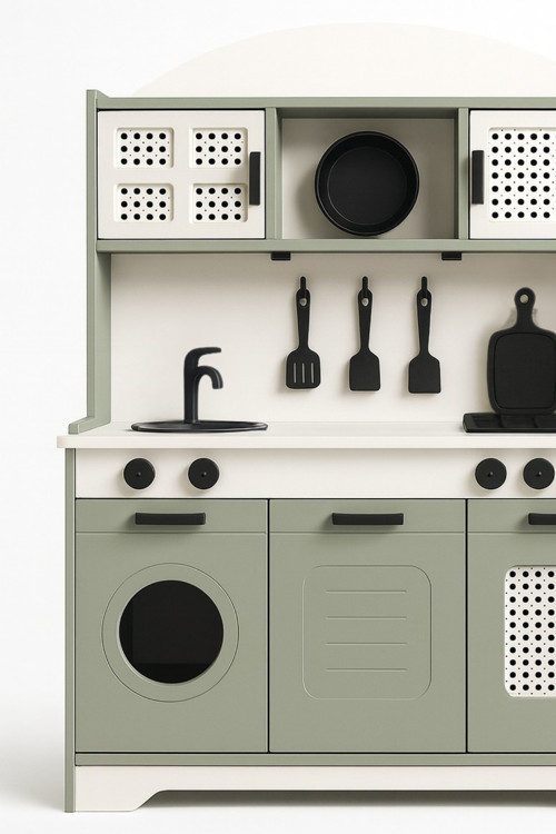 Çamsan marka 8mm kaliteli MDF ahşap kullanılmıştır. Ebatlar: genişlik: 82 cm, yükseklik: 101 cm, derinlik: 32 cm, tezgah yüksekliği: 51 cm. Çocuk sağlığına zararsız su bazlı akrilik boyalar kullanılmıştır. Ürün ıhlamur yeşili renklerde gönderilmektedir. Başka renk tercihi yoktur.