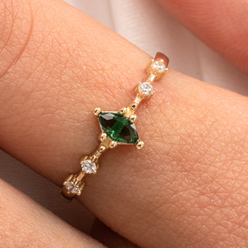 Minimal Altın Yüzük - 14 Ayar Altın Fantezi Mekik Zümrüt Yeşili Taşlı Tektaş Altın Yüzük