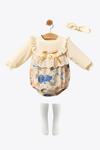 Minytrendy Kız Bebek Çocuk Keten Yenidoğan Romper Bandanalı Çoraplı Tulum Takımı Bebek Bayramlık Elbise