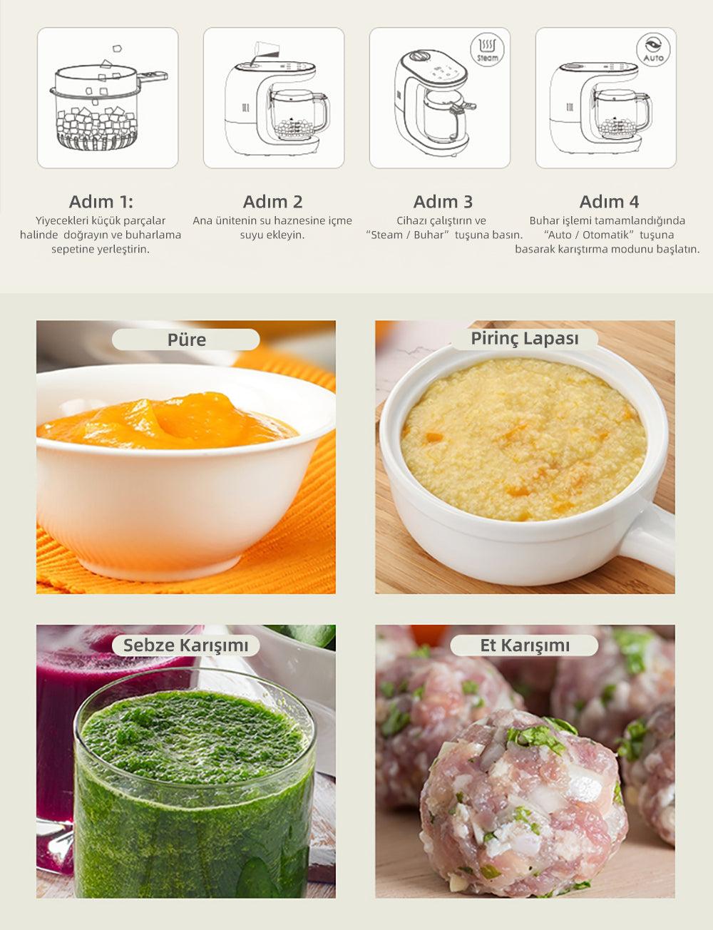 | Fonksiyonlar | Buz Çözme, Buharda Pişirme, Sterilizasyon, Otomatik Blender, Manuel Blender |