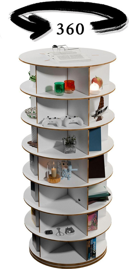 360° Dönen Raf, Dönen raf kulesi, Orijinal 7 katmanlı Dolap, 7 katlı Dönebilen Stand Bu 7 katlı döner kitaplık, şık ve fonksiyonel bir depolama çözümü sunar. Her katta 5 bölme vardır toplam. 35 farklı bölmeyi istediğiniz gibi doldurabilirsiniz Kendi etrafında dönebilme özelliği ile yer diğer kitaplık ve dolaplara göre yer kaplamadan şık bir tasarım sunar.