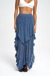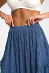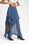 Beli büzgülü, lastikli, rahat formlu. Çift kat ve astarsız. Mendil kesim, fırfır detaylı midi asimetrik dantel etek.