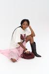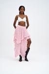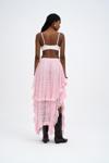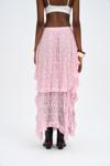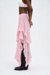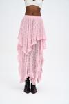 Beli büzgülü, lastikli, rahat formlu. Çift kat ve astarsız. Mendil kesim, fırfır detaylı midi asimetrik dantel etek.