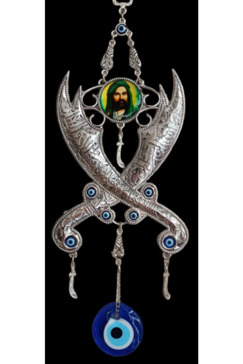 Nikel zamk kaplamalı Zülfikar kılıç dekoru Hz. Ali'nin fotoğrafı ve cam nazar boncukları ile detaylandırılmıştır. Duvar dekorumuz 35 x 11 cm. ölçülerinde özel tasarım olarak üretilmiştir. Zülfikar Kılıç Peygamberimizin Hz. Ali'ye hediyesi olan dünyadaki en ünlü kılıçlardan biridir.
