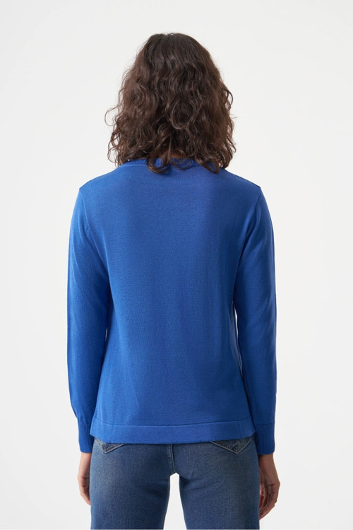- Saks rengi ile dikkat çeken bu triko, günlük kullanım için ideal bir seçenektir.