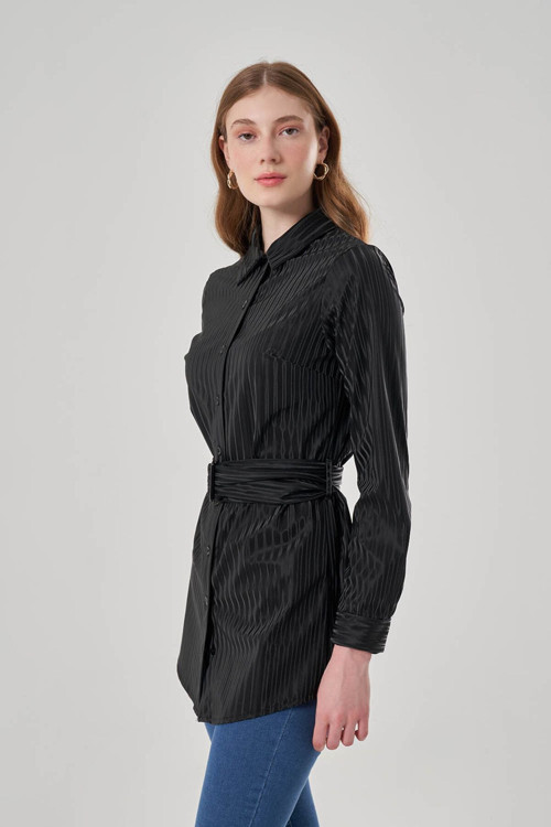 Standart boy ve kalıp seçenekleriyle her vücut tipine uyum sağlayan siyah tunik, rahatlığı ve şıklığı bir arada sunar