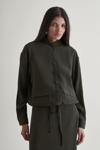 İp büzgü detayı cekete modern bir şıklık kazandırırken, torba cepler pratik ve stil sahibi bir kullanım sağlar.