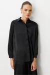 Mizalle Klasik Siyah Saten Gömlek Bluz, modern tasarımı ve kaliteli kumaş dokusuyla öne çıkan özel bir parçadır.