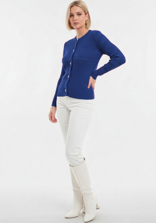 Mizalle Metal Düğmeli Yuvarlak Yaka Kaşkorse Saks mavi Hırka Bu saks mavisi tonundaki hırka, gardırobunuzun en şık ve kullanışlı parçası olmaya adaydır.