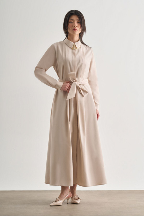 Mizalle Premium Saf Pamuk Taş Rengi Kalın Piliseli Uzun Elbise