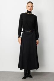 Mizalle Siyah A Kesim Kemerli Kalın Volanlı Maksi Etek, modern tasarımı ve kaliteli kumaş dokusuyla öne çıkan özel bir parçadır.