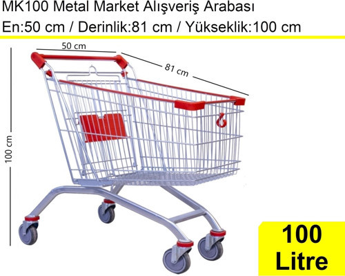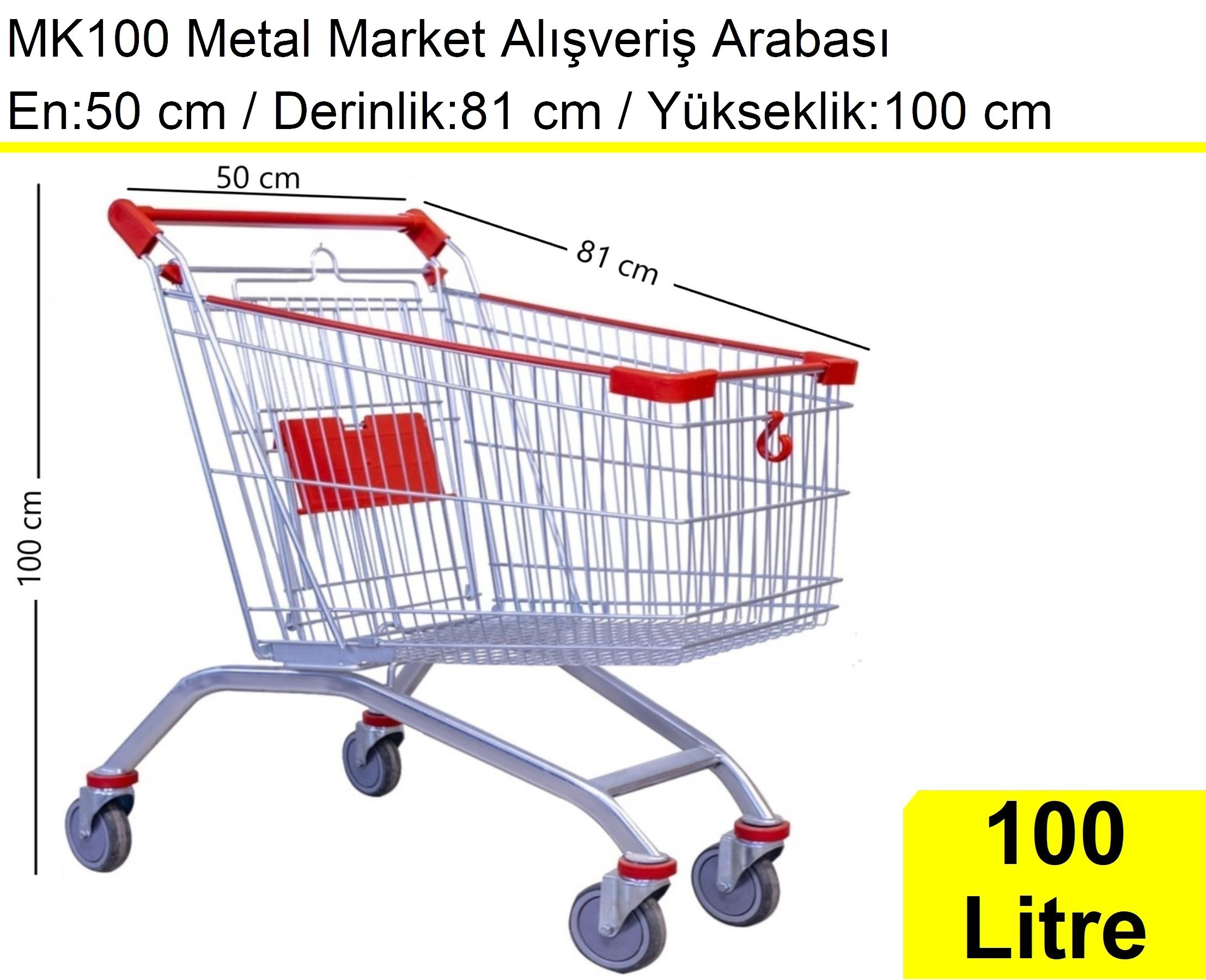 100 Lt, 125 Lt, 150 Lt, 180 Lt, ve 210 Litre seçenekleri ile perakende sektörüne sunulan MK100 metal market arabası, galvaniz kaplama yapılarak perakende sektöründe birçok firma tarafından tercih edilmektedir. MK100 market arabasında yer alan plastik malzeme, Polietilendir. Güçlü yüzey kaplaması ve dayanıklı yapısıyla MK100 market arabaları, süpermarket, hipermarket, şarküteri gibi müşteri sirkülasyonunun hızlı olduğu yerlerde özellikle tercih edilmektedir.