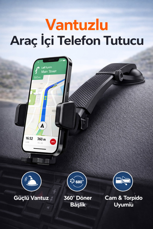 Güçlü vakumlu suction cup vantuz sistemi, ön cam veya torpido yüzeyine sıkıca tutunarak uzun süreli kullanım sunar.