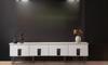 Tv sehpası, Mdf malzeme üzeri lake boyadan üretilmiştir.CNC desenlerle dekore edilmiştir. Ayaklar ahşap malzemedir. Çekmecelere stoper sistemi bulunmaktadır.