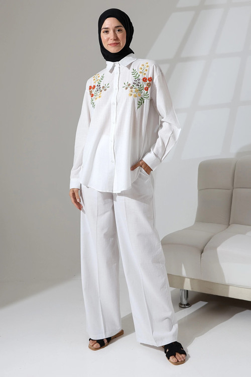 Moda 100% Pamuk Keten Günlük ve Rahat Çiçek Desen Nakışlı Taşlı Gömlek Pantolon Yazlık Alt Üst Takım