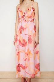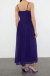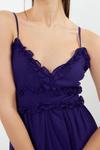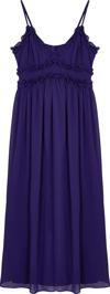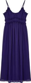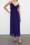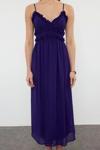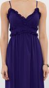 Ersefa Moda Askılı V Yaka Mor Çiçekli Desenli A-Kesim Fırfır Detaylı Astarlı Şifon Maxi Dokuma Elbise